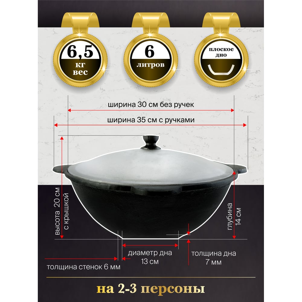 Материал чугун Объем 6 л Вес нетто 6.5 кг Материал крышки алюминий Материал рукояти чугун Тефлоновое покрытие нет Для газовых плит да Для индукционных плит да Для электрических плит да Мойка в посудомоечной машине нет Антипригарное покрытие нет Крышка в комплекте есть Толщина стенок 6 мм Можно использовать в духовке да