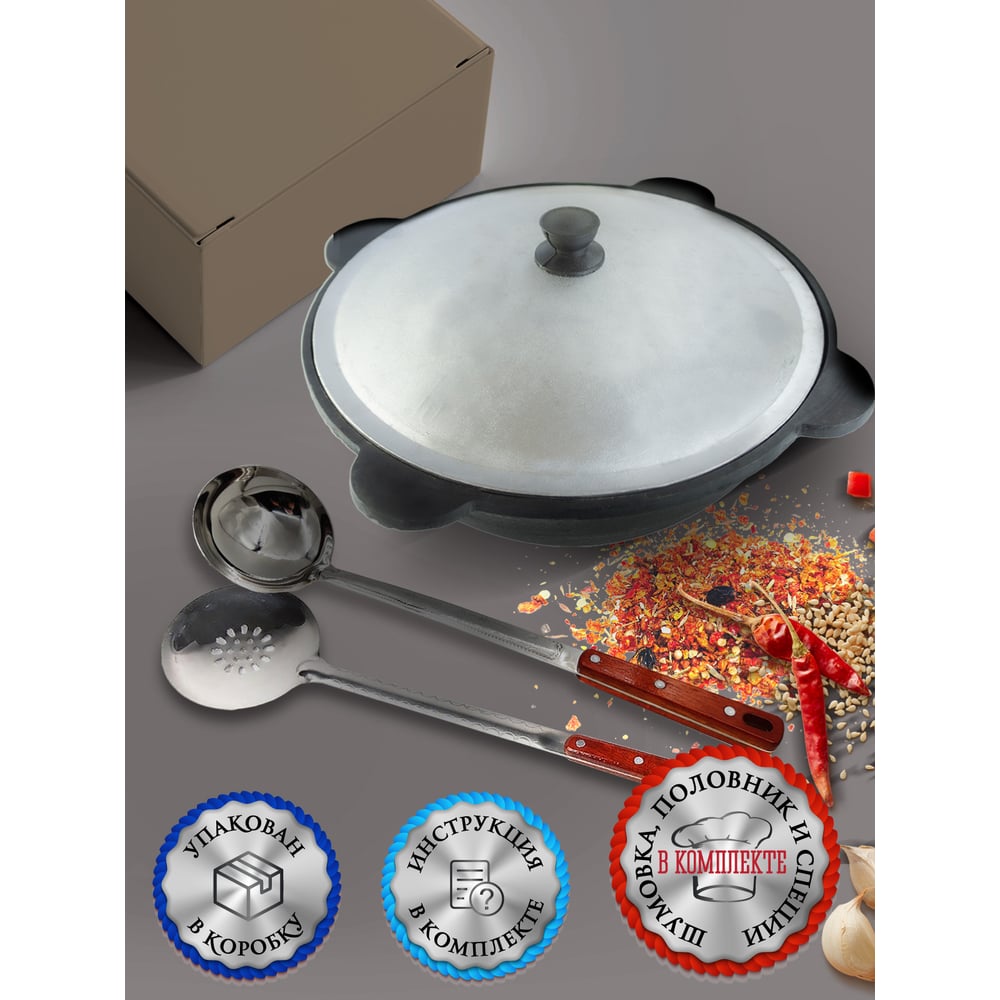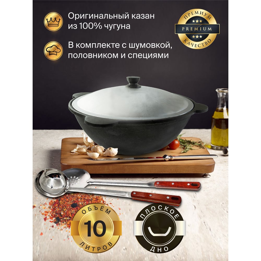 Чугунный казан Davr Metall Узбекский 10 л, плоское дно, с алюминиевой крышкой, с шумовкой, половником и специями КазУз10ЛПШПС