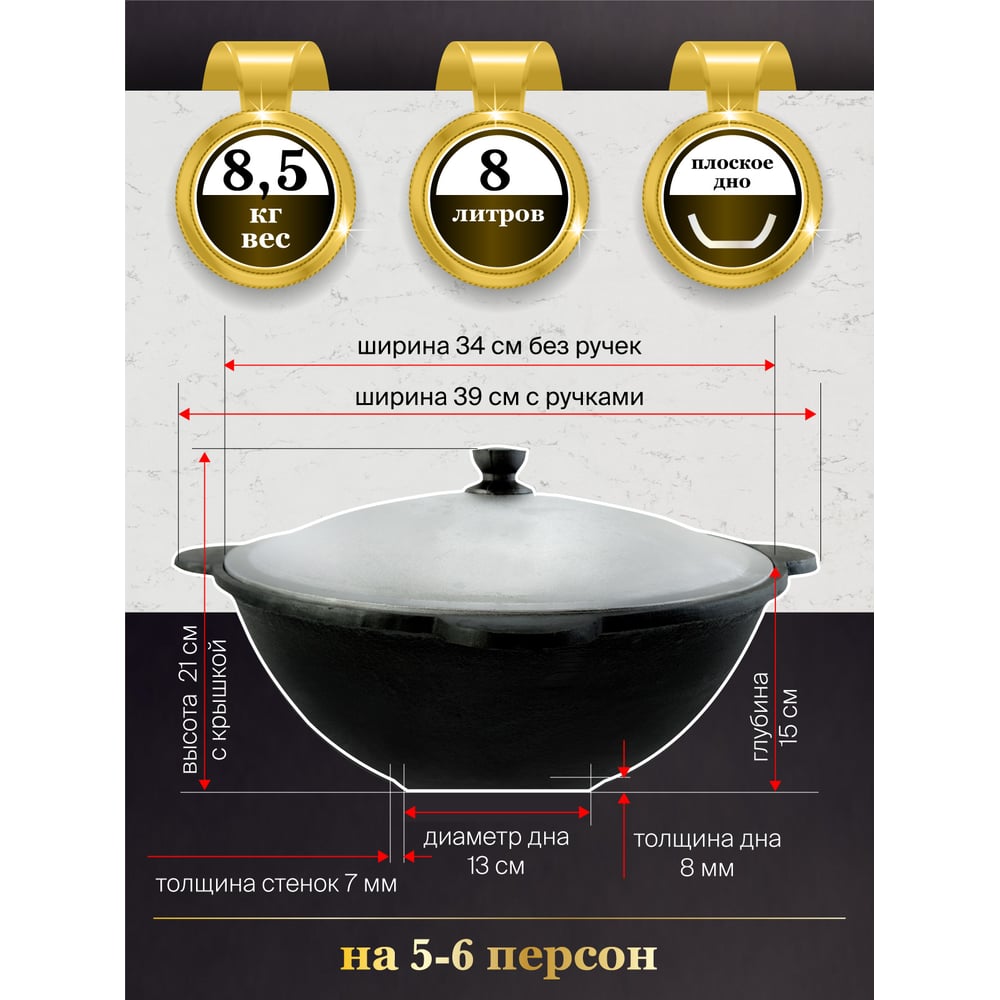 Материал чугун Объем 8 л Вес нетто 8.5 кг Материал крышки алюминий Материал рукояти чугун Тефлоновое покрытие нет Для газовых плит да Для индукционных плит да Для электрических плит да Мойка в посудомоечной машине нет Антипригарное покрытие нет Крышка в комплекте есть Толщина стенок 7 мм Можно использовать в духовке да