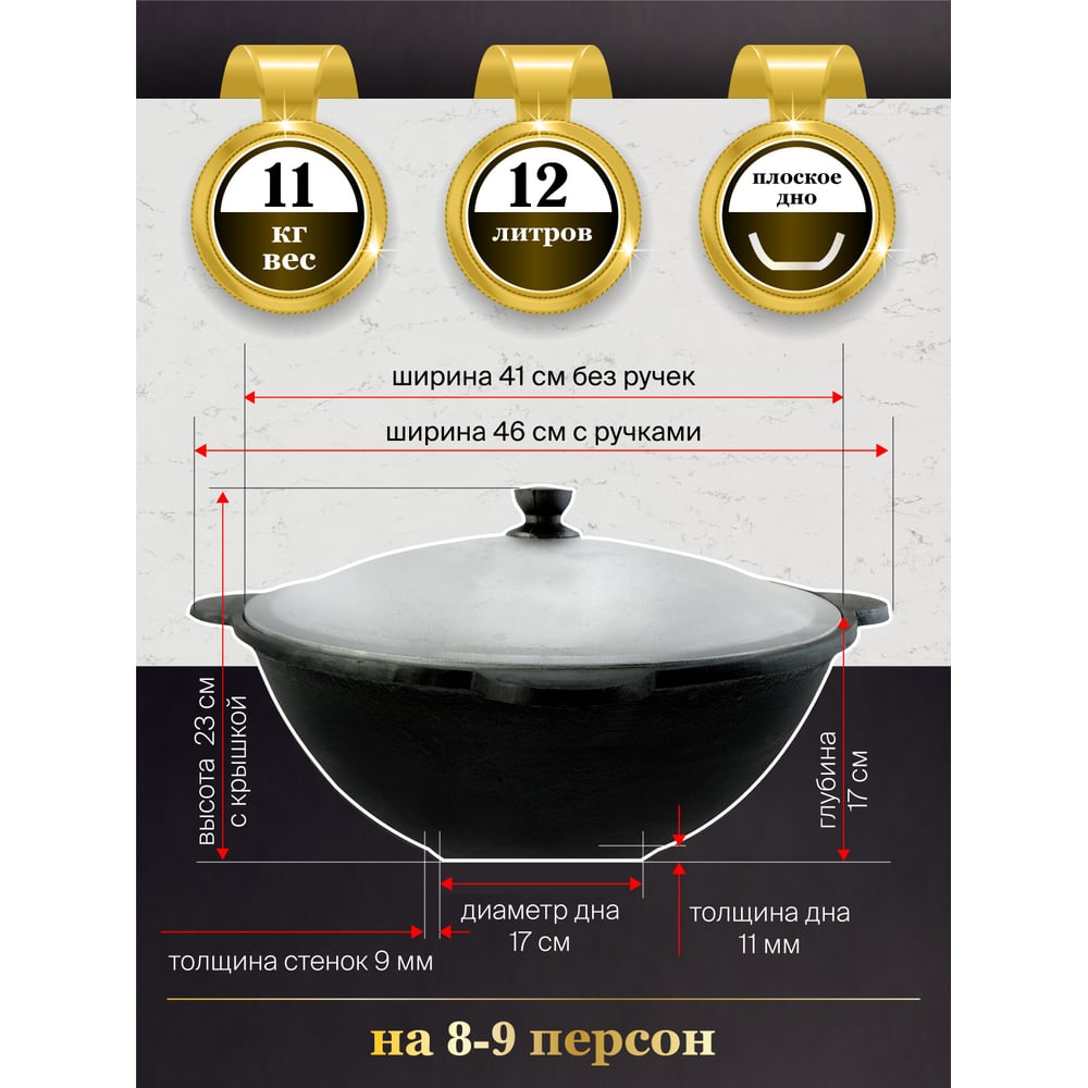 Материал чугун Объем 12 л Вес нетто 11 кг Форма круглая Материал крышки алюминий Материал рукояти чугун Тефлоновое покрытие нет Для газовых плит да Для индукционных плит да Для электрических плит да Мойка в посудомоечной машине нет Антипригарное покрытие нет Крышка в комплекте есть Толщина стенок 9 мм Можно использовать в духовке да
