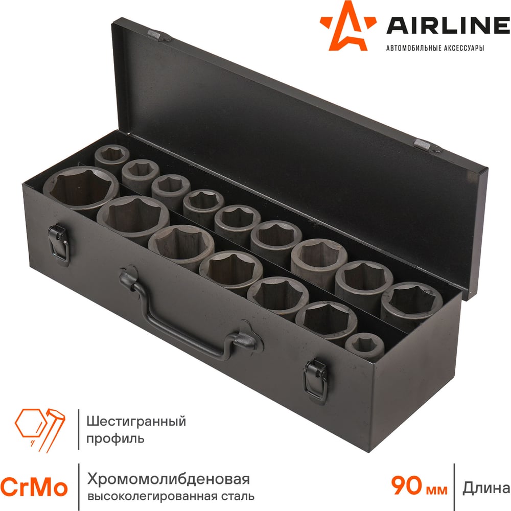 Набор головок ударных 16 шт, 17-50 мм, 90 мм, 3/4", металлический кейс Airline ATAS045