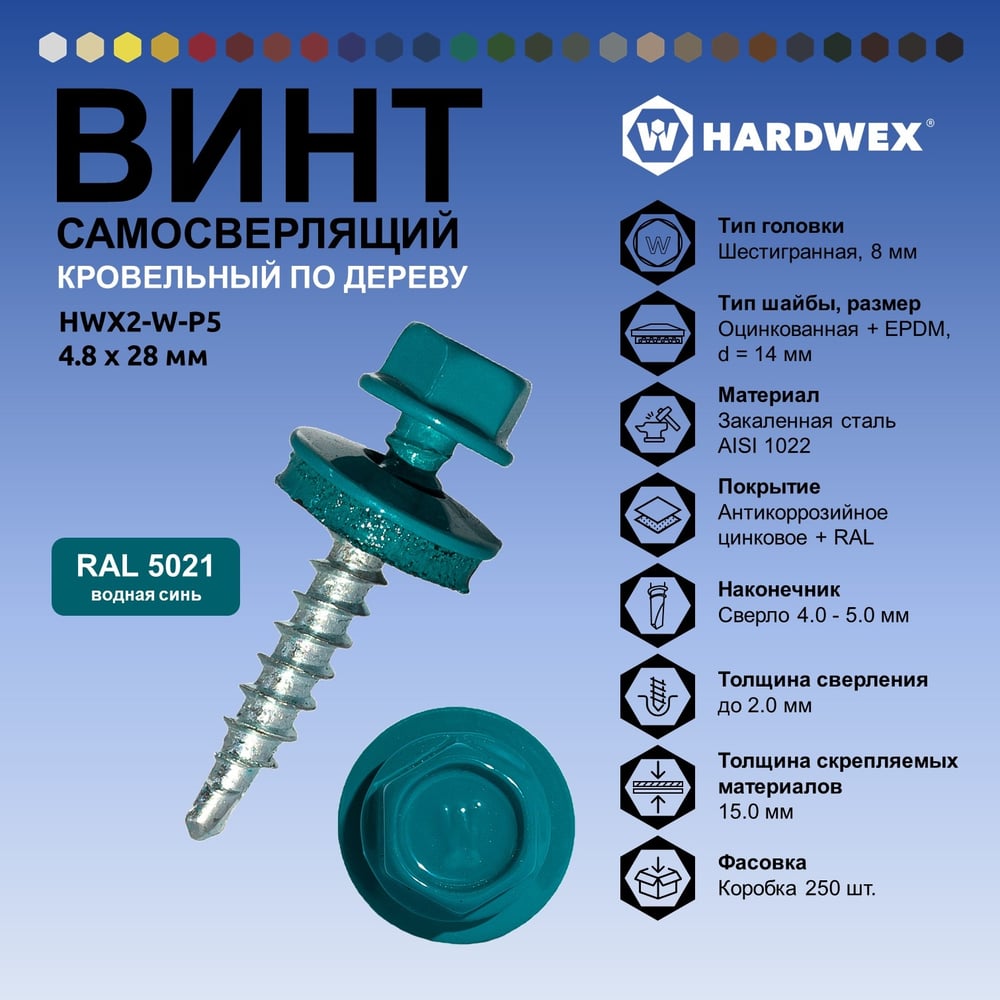 Саморез кровельный по дереву HARDWEX ТМ HWX2-W-P5-4.8x28 мм, св.№1, RAL 5021, 250 шт. 5190000001789