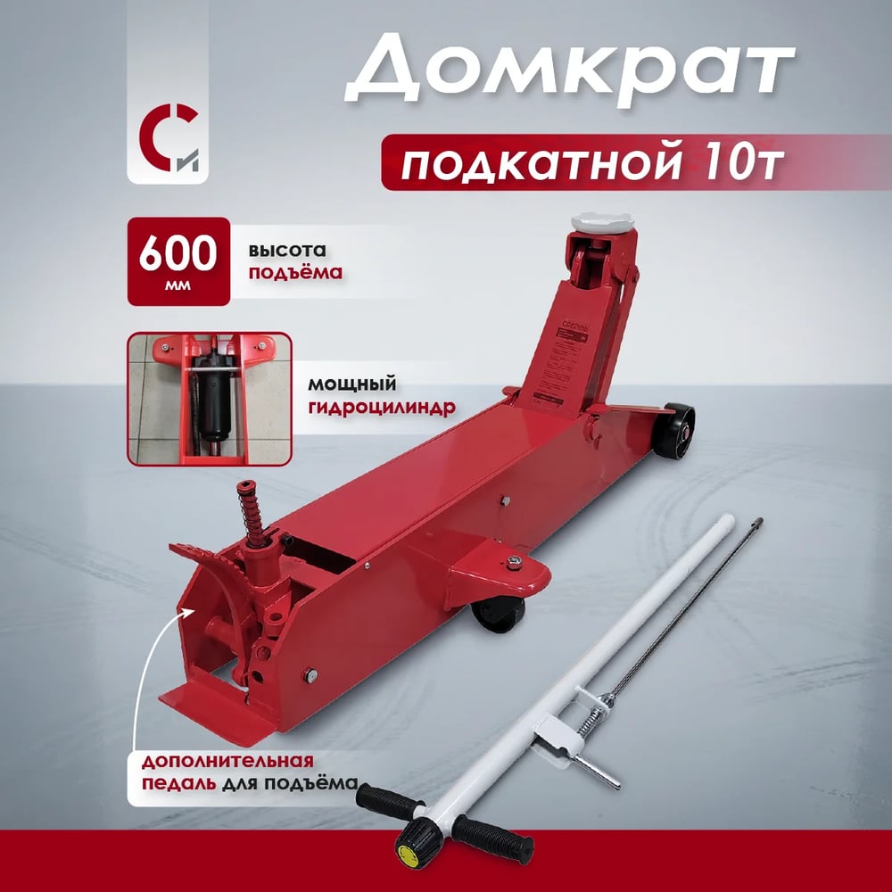 Габариты без упаковки 1655х515х330 мм Класс товара Профессиональный Вес нетто 108 кг Материал корпуса металл Высота подъема 600 мм Высота подхвата 160 мм Кейс нет Фиксатор нет Грузоподъемность 10 т С педалью да Тип привода гидравлический Рабочий ход 440 мм Тип домкрата подкатной Поворотная рукоятка есть Диаметр опоры 130 мм Двухцилиндровый нет Ручка для переноски нет Длина рукояти 1060 мм