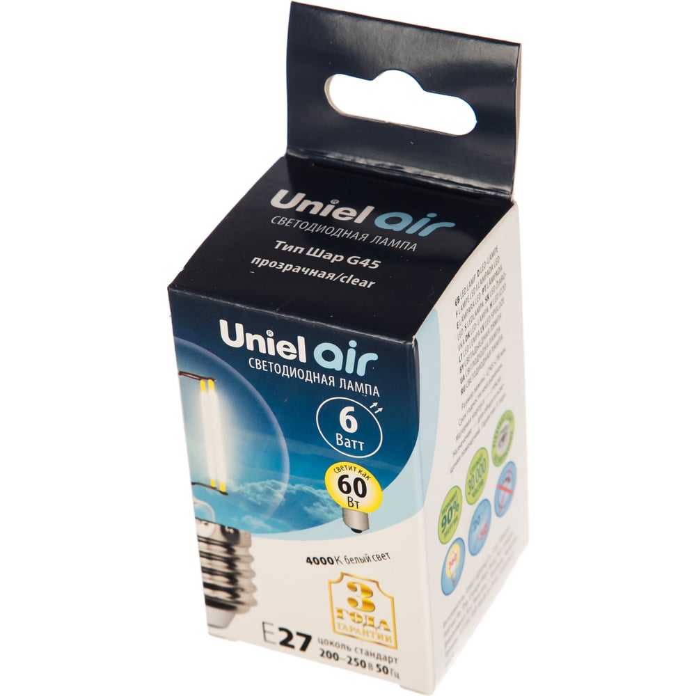 Светодиодная лампа Uniel LED-G45-6W/NW/E27/CL GLA01TR . Форма шар, прозрачная. UL-00002208