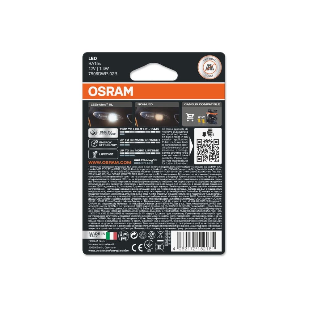 Автолампа OSRAM P21W, BA15s, LED, 2 шт., 6000 К, 12 В 7506DWP-02B