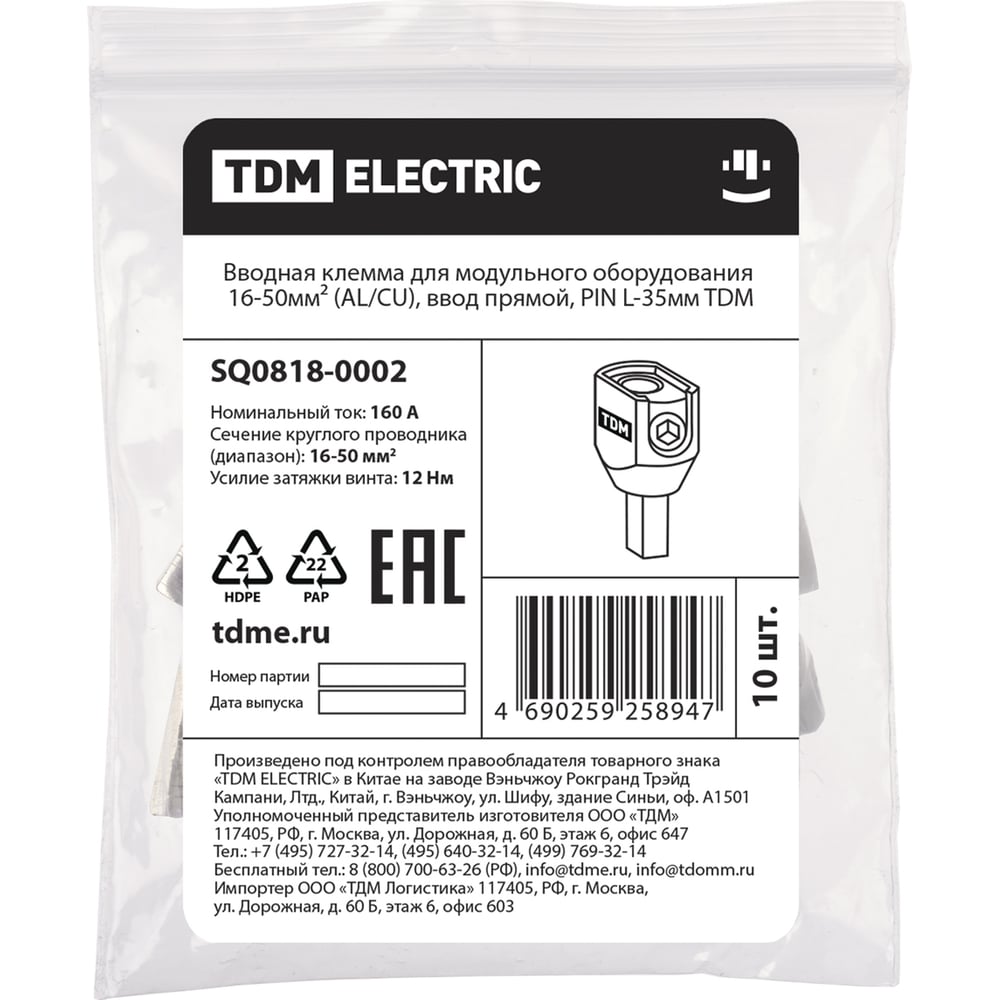 Вводная клемма TDM ELECTRIC для модульного оборудования 16-50мм² (AL/CU), ввод прямой, PIN L-35мм SQ0818-0002