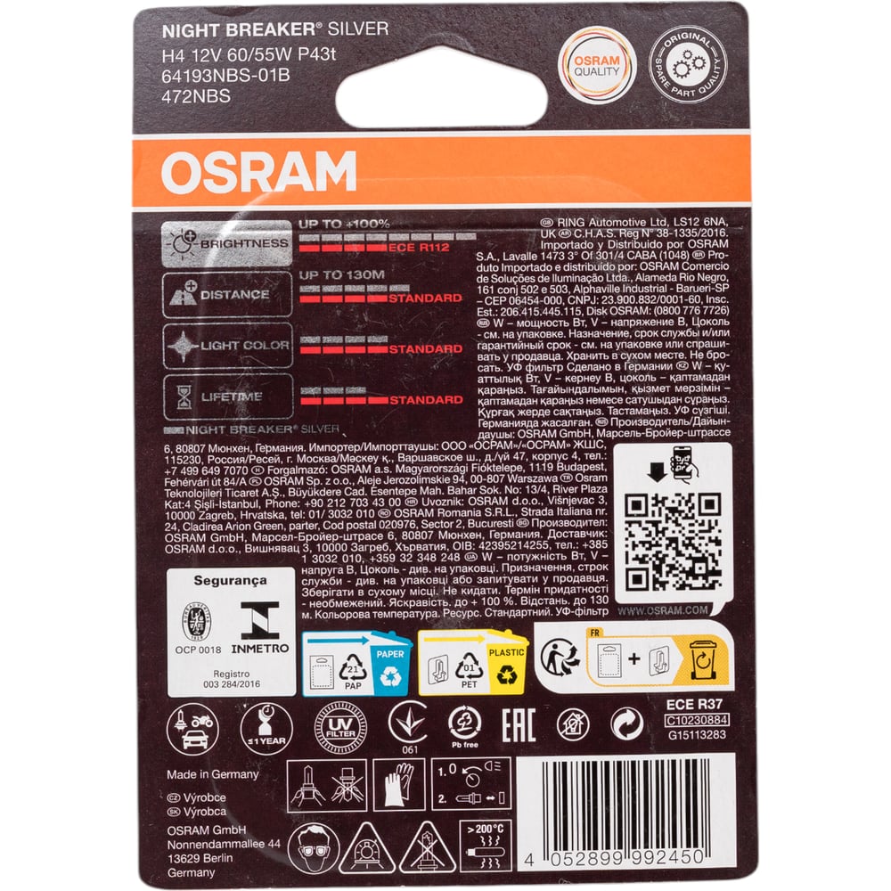 Автолампа Osram H4 60,55 P43t+100 NIGHT SILVER 12V ,1,10 64193NBS-01B