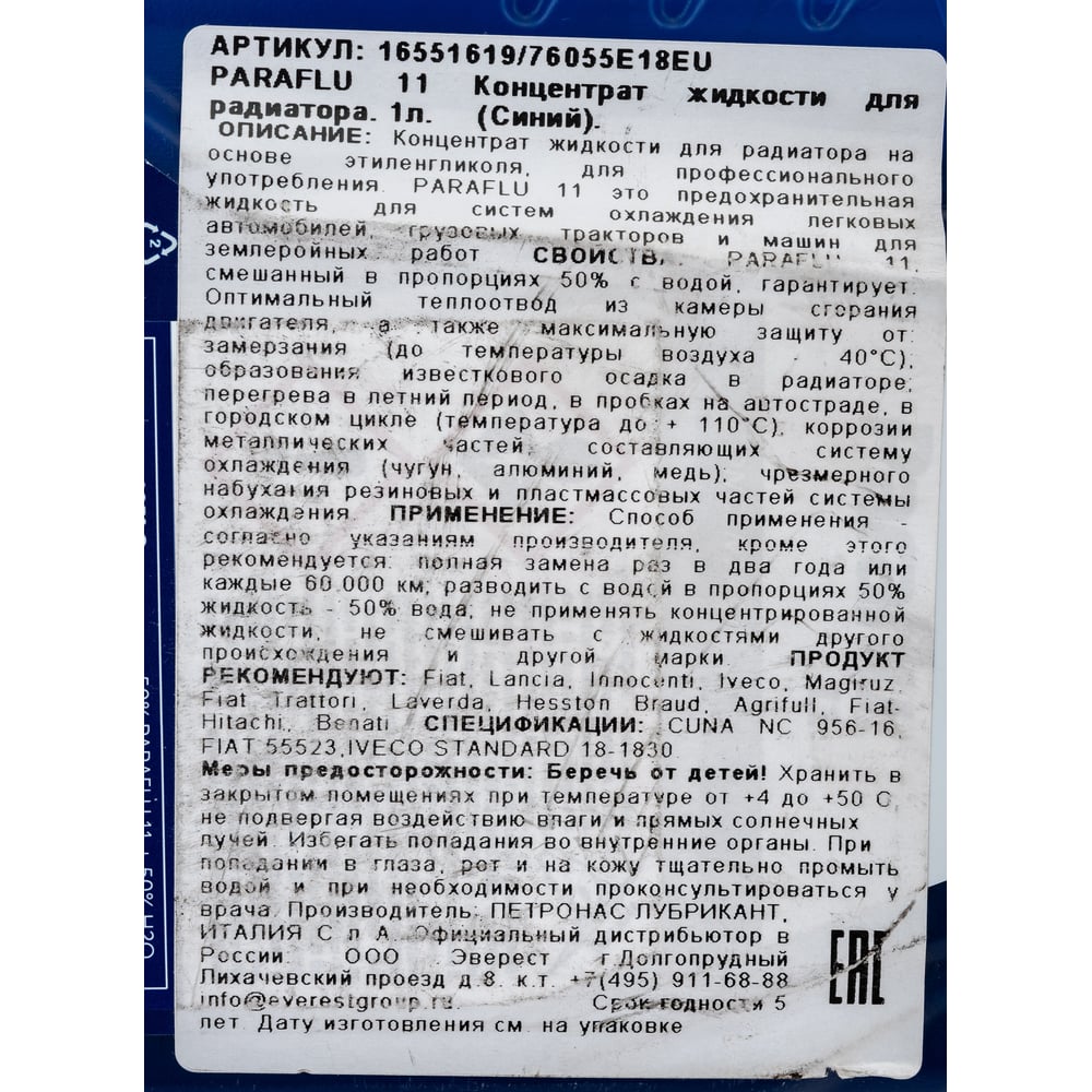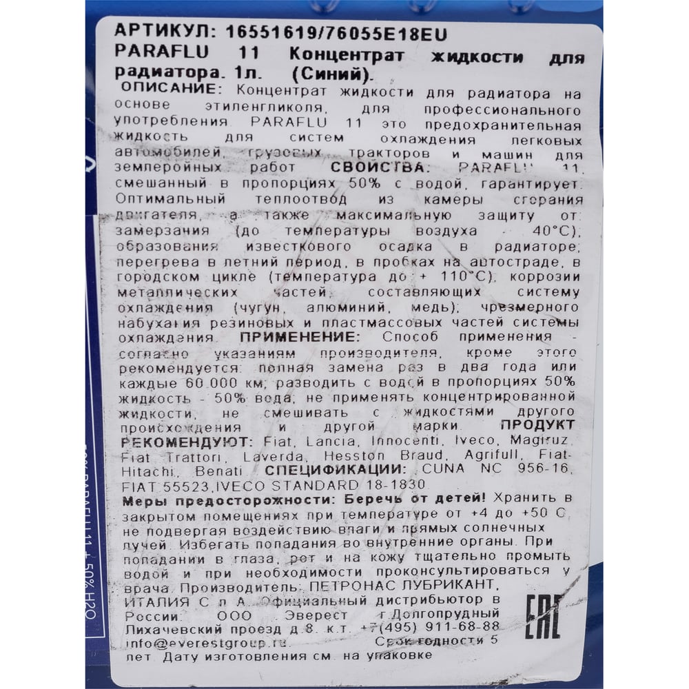 Антифриз PETRONAS PARAFLU 11 канистра пластик 1 л 76055E18EU/16551619 81139E18EU