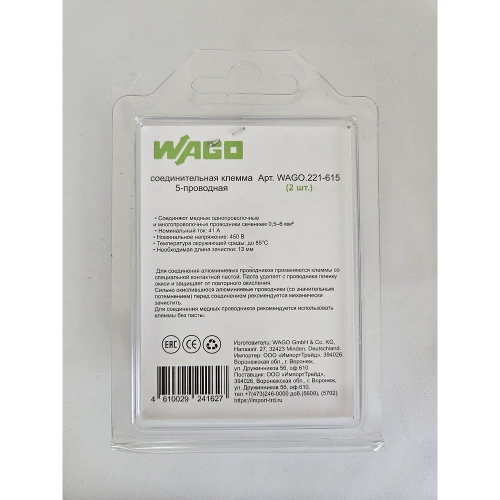 Соединительная клемма с рычажком WAGO 221-615 5-ти проводная 0,5-6кв.мм, 450В, 41А, 2 шт. 41627
