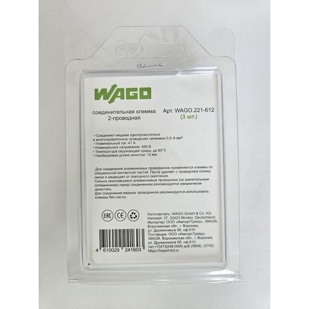Соединительная клемма WAGO с рычажком 221-612, 2-х проводная 0,5-6 кв.мм, 450В, 41А, 3 шт 41603