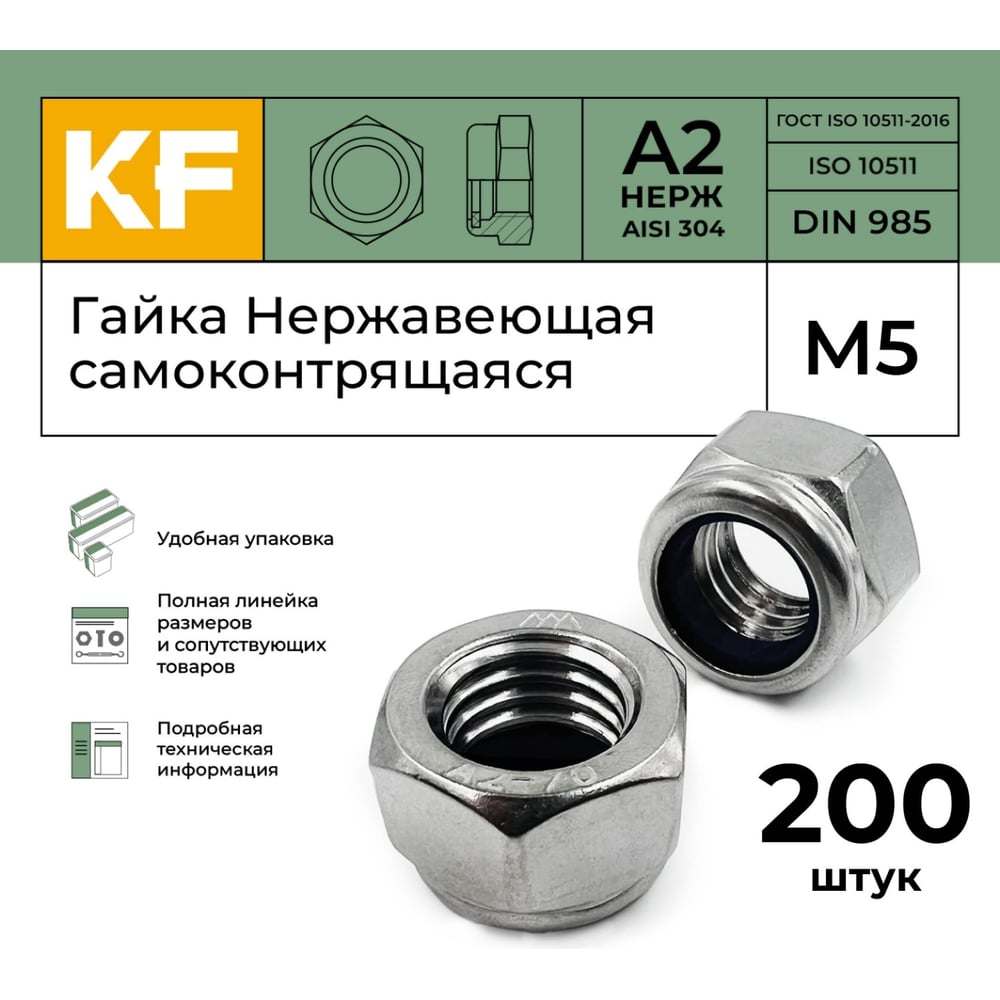 Нержавеющая самоконтрящаяся гайка KREPFIELD М5, DIN 985, А2, 200 шт. 985А2-70ГАЙКАМ5-200