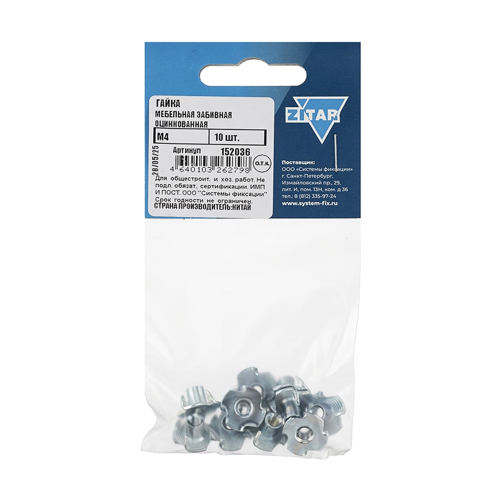 Гайка мебельная забивная оцинкованная М4 (10 шт), пакет Zitar 152036
