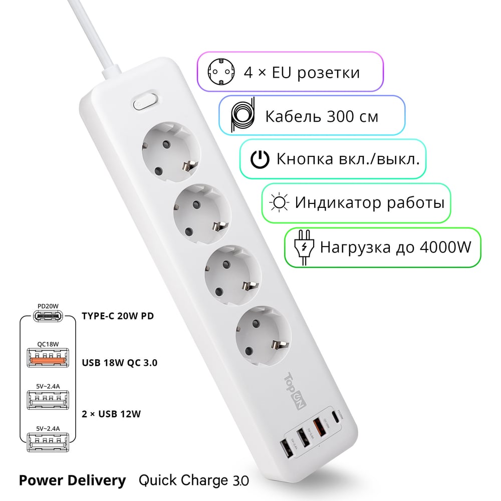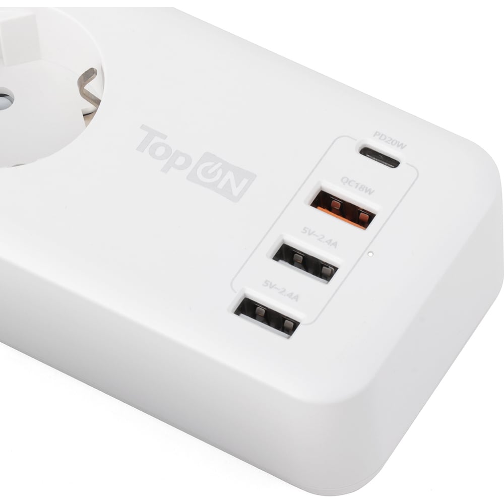 Сетевой фильтр TopOn TOP-PWS4 4 розетки, 3 USB, Type-C, PD 20W QC3.0, 4000W, 3м Белый TOP-PWS4-3