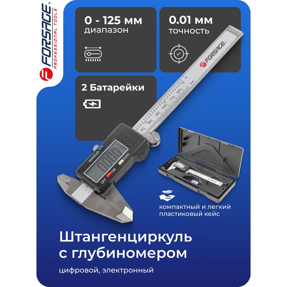 Электронный штангенциркуль Forsage 0-125 мм, 0,01 мм; внутр, Ø, наруж, Ø + глубиномер, в пластиковом футляре F-5096PE(18056)