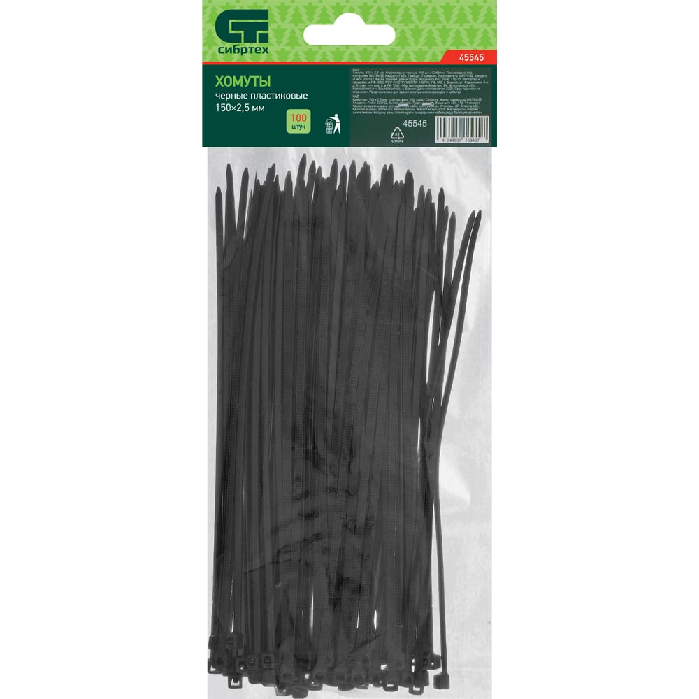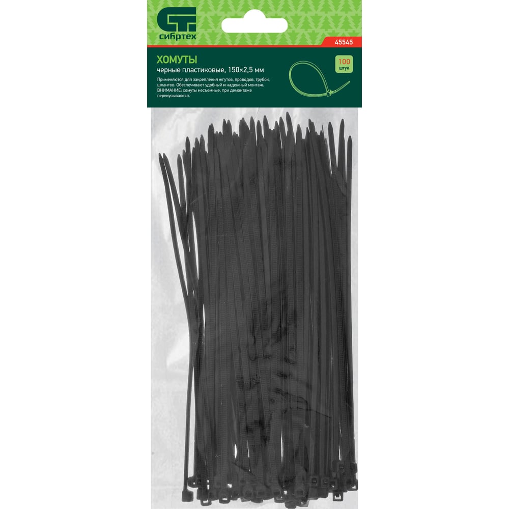 Хомуты СИБРТЕХ 150x2,5 мм, пластмассовые, черные, 100 шт 45545
