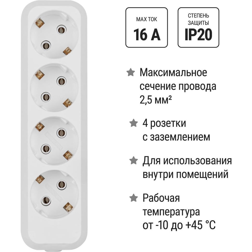 Высота 310 мм Длина 41 мм Ширина 125 мм Цвет белый Вид Бытовой Тип колодка розеточная Класс товара Бытовой Вес нетто 0.154 кг Материал корпуса АВС-пластик Степень защиты IP20 Выключатель на корпусе нет Модельный ряд Народная Световая индикация нет Заземление есть Напряжение сети 250 В Номинальная сила тока 16 А Защитные шторки нет Крепление на стену нет Max нагрузка (Вт) 4000 Количество розеток 4 шт Наличие крышки нет Max нагрузка (кВт) 4 Тип розетки Schuko