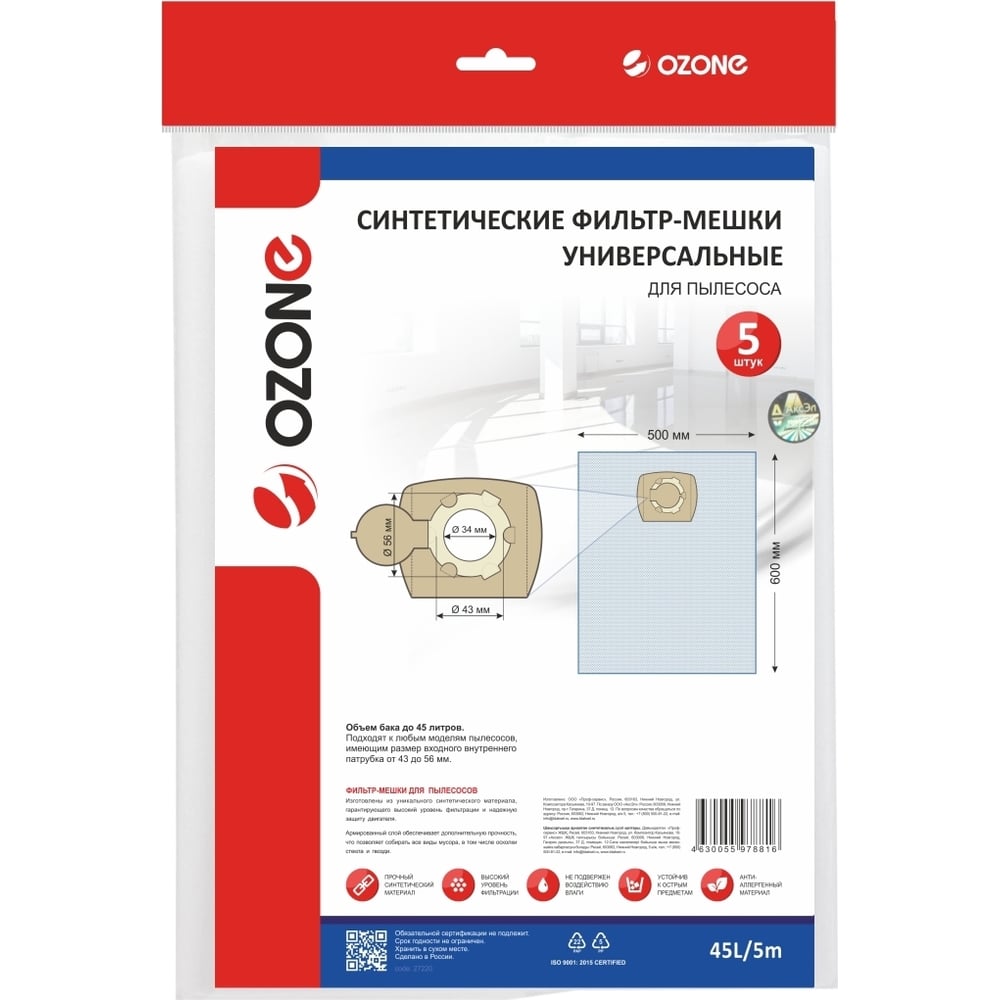 Универсальные фильтр-мешки для проф. пылесосов OZONE арт. 45L/5m