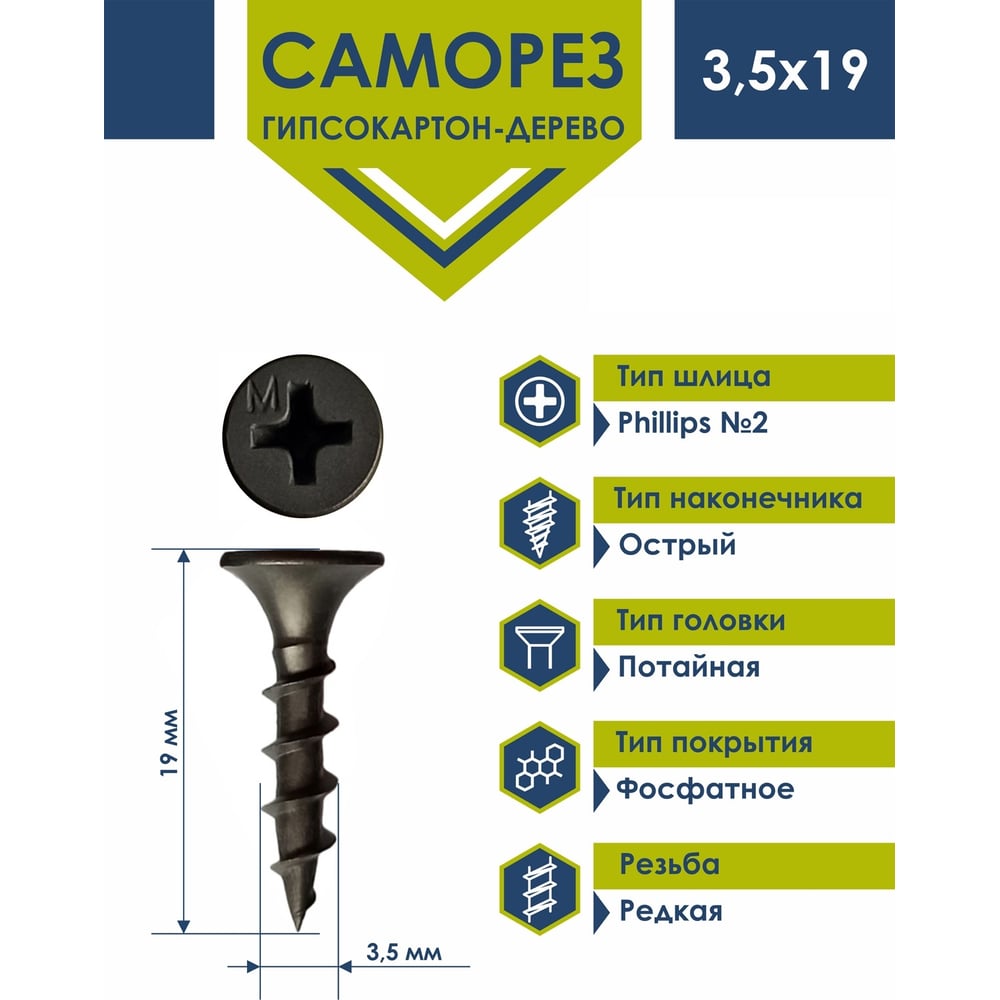 Длина 19 мм Тип резьбы редкая Тип фасовки кг Материал углеродистая сталь Покрытие фосфатированный Диаметр 3.5 мм ГОСТ 59571-2021 Наличие пресс-шайбы нет Нержавеющая сталь нет Цвет покрытия черный Форма головки потайная Размер шлица PH2 Шлиц Phillips (PH) Наконечник острый Полная резьба да Фасовка 1 кг