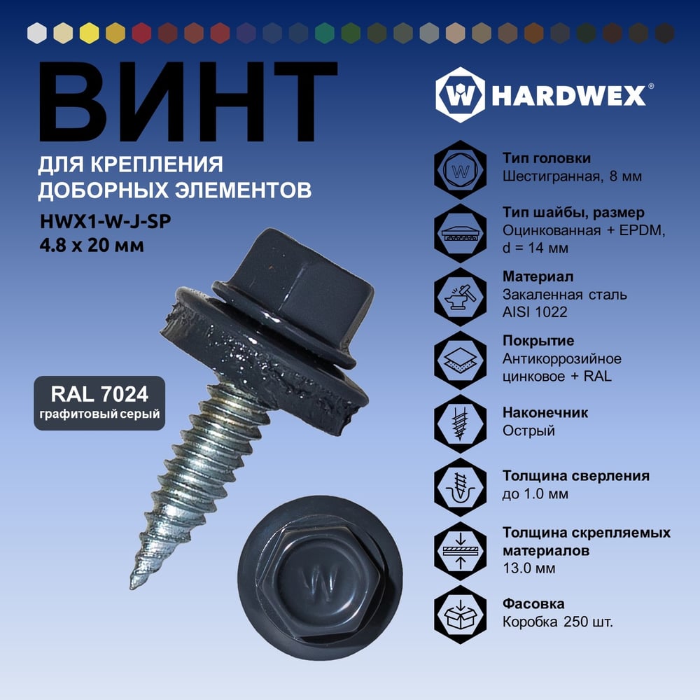 Винт HARDWEX ТМ HWX1-W-J-SP-4.8x20 мм., RAL 7024 (250 шт.) 5190000001260