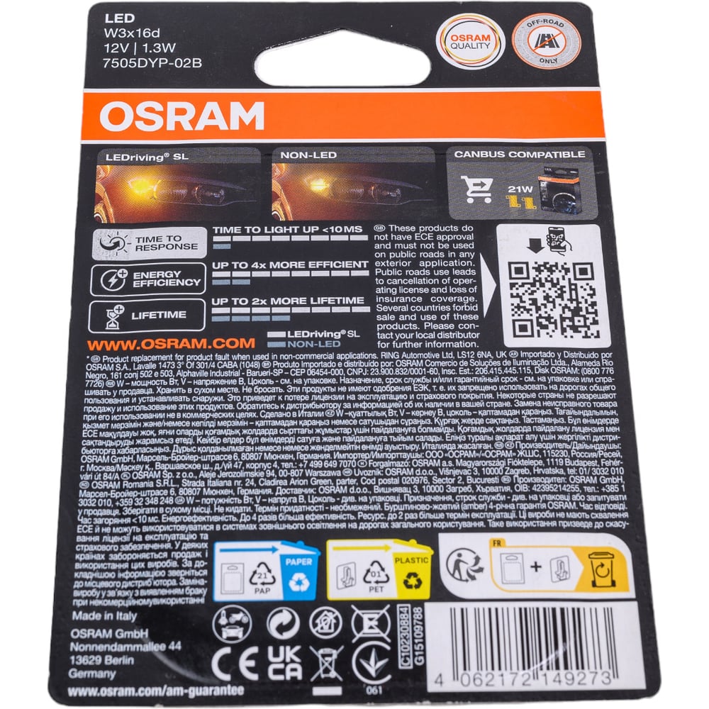 Автолампа Osram WY21W W3x16d LED YELLOW 12V 7505DYP-02B