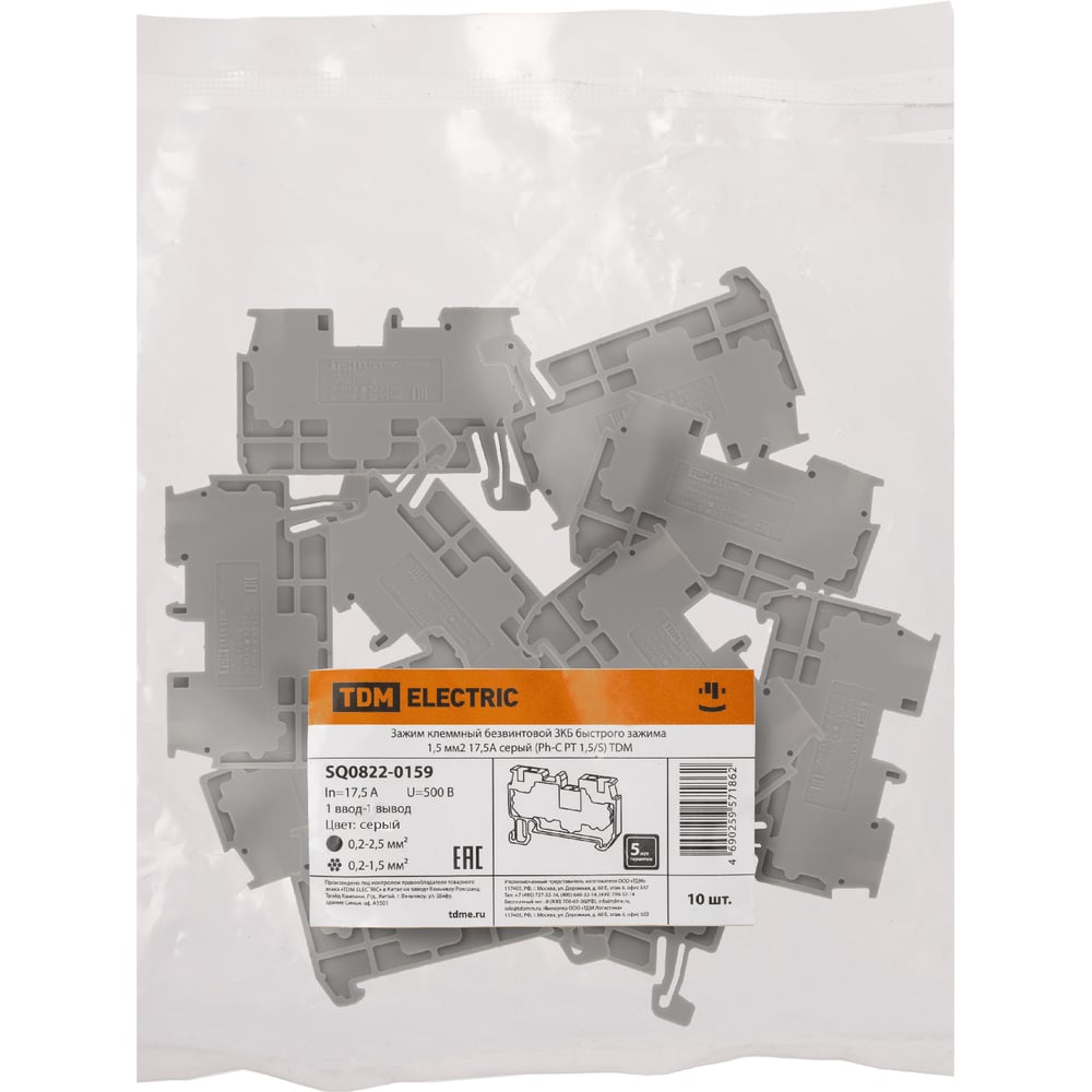 Безвинтовой клеммный зажим TDM ELECTRIC ЗКБ быстрого зажима, 1.5 кв. мм, 17.5А, серый (Ph-C PT 1,5/S) SQ0822-0159