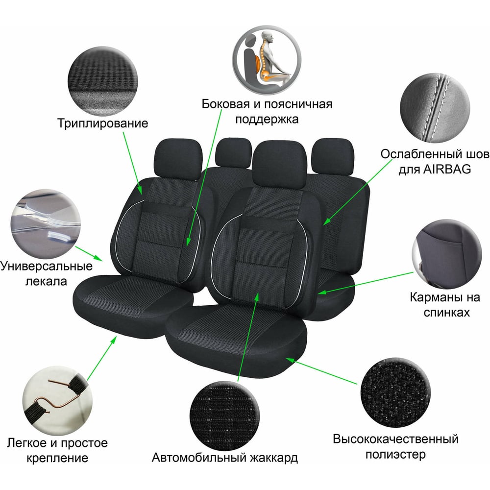 Чехлы для сидений Airline MONRO универсальные, 11 предметов, повышенный комфорт, жаккард, черные ACS-UJ-01