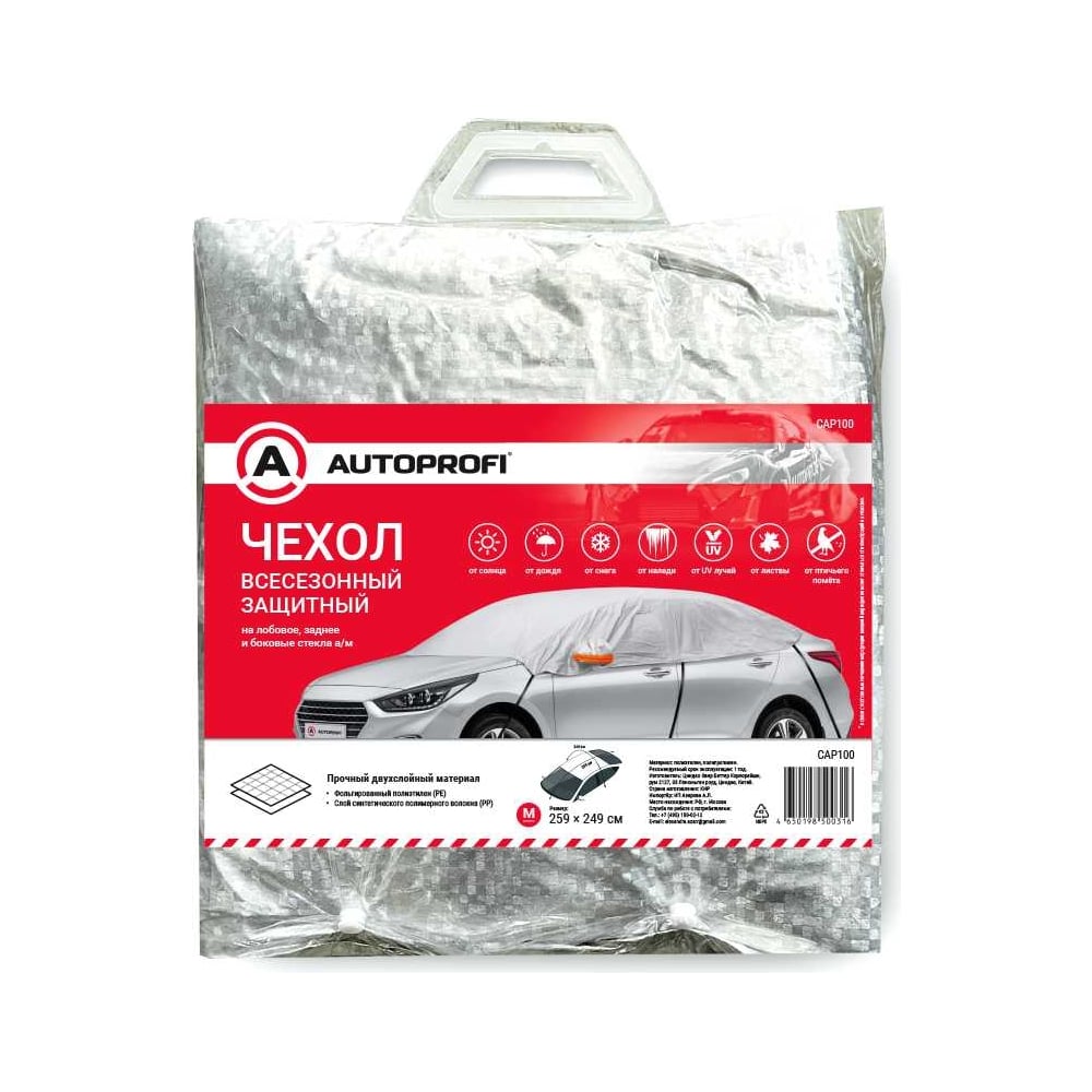 Всесезонный защитный чехол на лобовое, заднее и боковые стекла автомобиля AUTOPROFI размер M, 259x249 см, прочный двухслойный материал: фольгированный полиэтилен (PE) CAP100