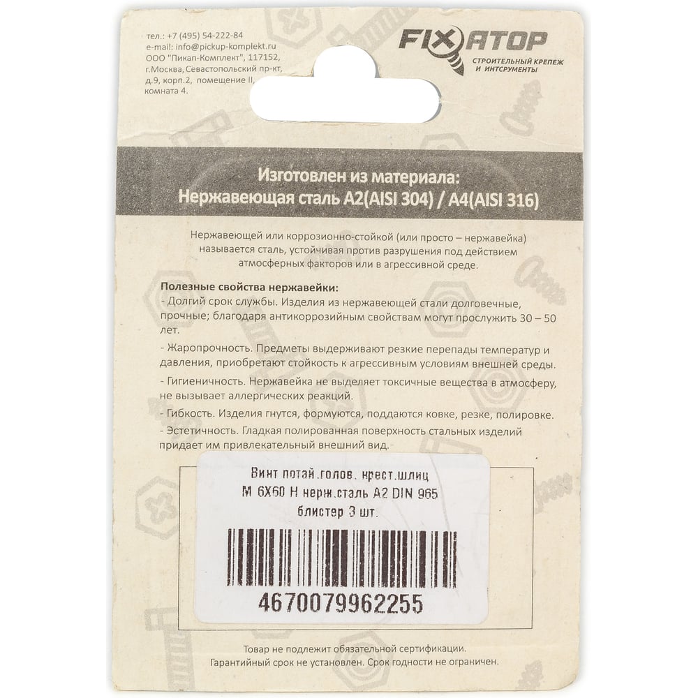 Винт FIXATOP потай. голов., крест. шлиц М6х60 H нерж. сталь A2, DIN 965, блистер, 3 шт 00000090002