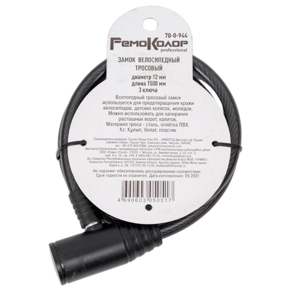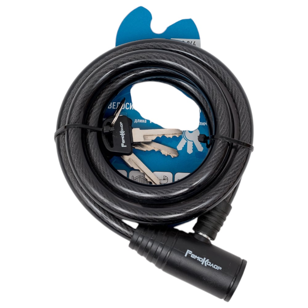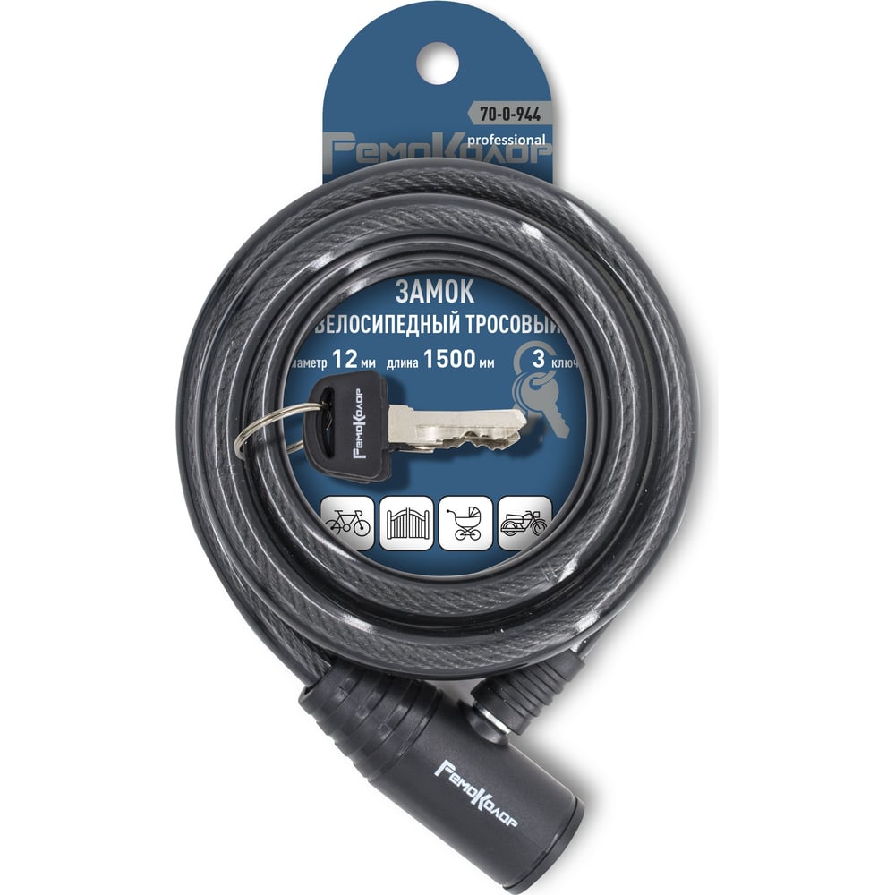 Велосипедный тросовый замок РемоКолор 3 ключа, 12x1500 мм 70-0-944