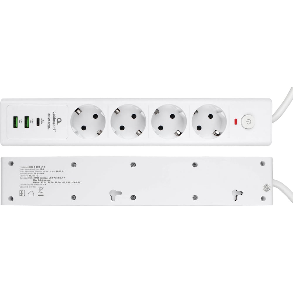 Сетевой фильтр Cablexpert exnovo, 4р, 16а, 1xtype-c pd, 30вт, 2хusb, 2м, ур.защиты 4+, белый, EXN-4-CU2-W-2