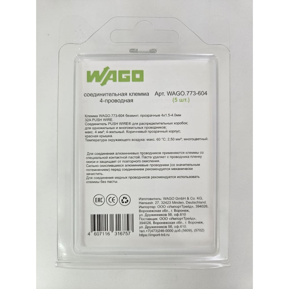 Соединительная клемма WAGO 4-х проводная 773-604 5 шт. в блистере