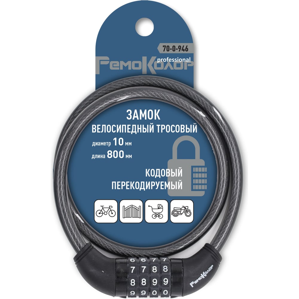 Велосипедный тросовый замок РемоКолор кодовый, перекодируемый, 10x800 мм 70-0-946