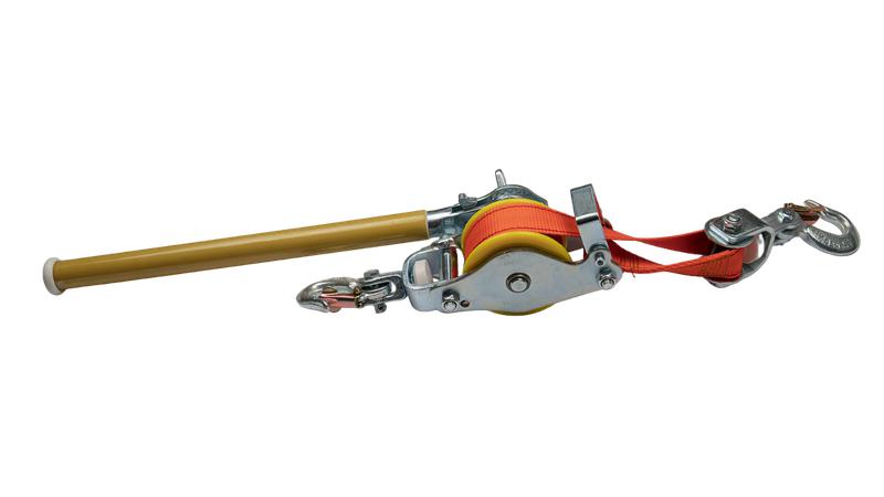 Лебедка ручная представляет собой грузоподъемный механизм, таль которого выполнена из нейлоновой стропы, приводной барабан выполнен из металлической обоймы и диэлектрического основания, снабжена блочным механизмом, что позволяет увеличить тяговое усилие.
