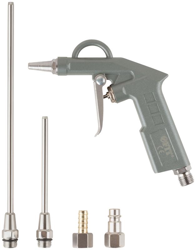 Пистолет продувочный FIT IT, работающий от пневматического компрессора, предназначен применяется при очистке различных полостей, отверстий, пазов, поверхностей от пыли и механических загрязнений. Корпус изготовлен из алюминия, что обеспечивает долгий срок службы инструмента. Инструмент отличается малым весом и не утомляет руку во время длительного использования. Эргономичная рукоятка имеет противоскользящую текстурированную поверхность. Соединение — внешняя резьба 1/4". Комплектация: пистолет продувочный, насадка 215 мм, насадка 100 мм, 1/4" адаптер под быстросъемное соединение, адаптер ‘’елочка’’.