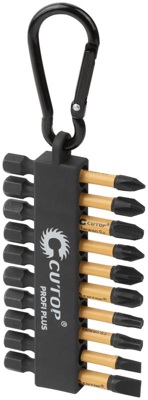 Набор торсионных бит Cutop Profi Plus, состоящий из 10 предметов, предназначен для использования с шуруповертами и гайковертами. Подходит для работы с ударным инструментом. Биты произведены по технологии CUTOP, изготавливаются из тайваньской стали высшего качества марки S2. За счет эффекта скручивания торсионная бита способна к работе на высоких крутящих моментах, что способствует сохранению шлица биты, крепежа и увеличенному сроку службы. Намагниченный шлиц обеспечивает дополнительное удобство в работе, а также предотвращает выскальзывание, что препятствует повреждению биты и крепежа. Биты выдерживают существенный крутящий момент, что подтверждается собственными испытаниями. Набор крепится на карабин, что способствует скорости и удобству работ.