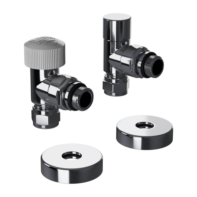 Термостатические наборы серии Design Pro поставляется в необходимой для чистового монтажа комплектации: клапан термостатический для установки на подающий трубопровод, запорный клапан для установки на обратный трубопровод, 2 гайки-фитинга для подключения клапанов к монтажной трубке 15 мм и 2 цельных латунных отражателя с внутренним резиновым уплотнением внутренним диаметром 15,2 мм.