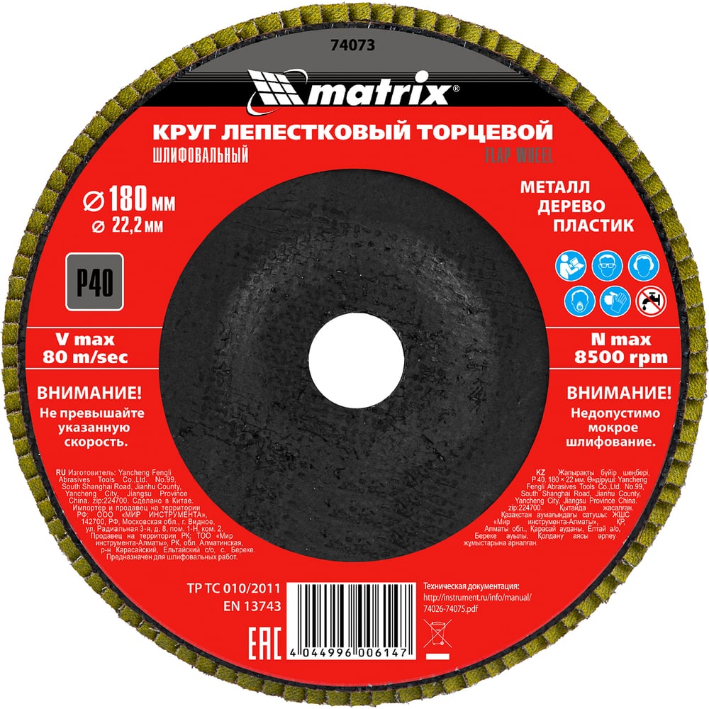 Круг лепестковый торцевой (180х22.2 мм; P40) для УШМ Matrix 74073