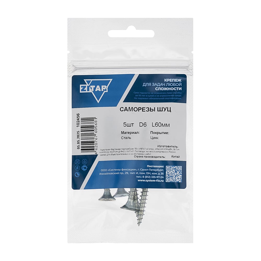 Саморез ШУц 6,0х60 потайная головка 5 шт, пакет Zitar 102456