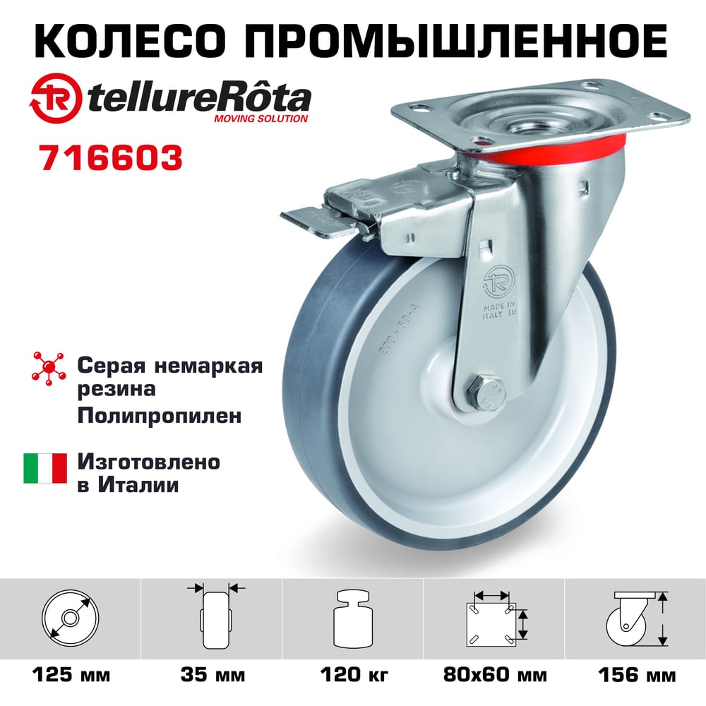Колесо с вращающейся опорой, пластиной крепления и передним тормозом (125 мм; 120 кг) Tellure rota 716603