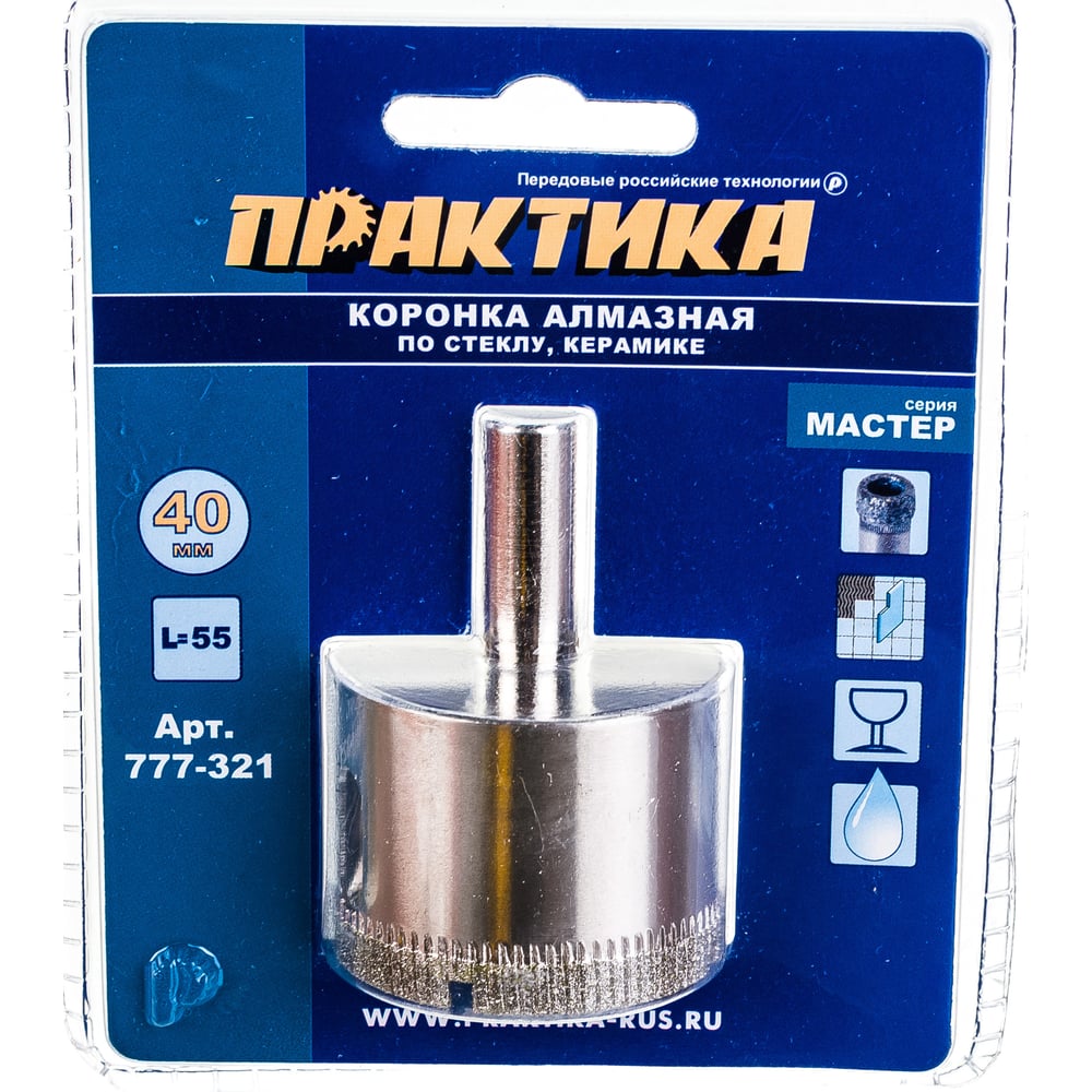 Коронка алмазная по стеклу и керамике (40 мм) ПРАКТИКА 777-321