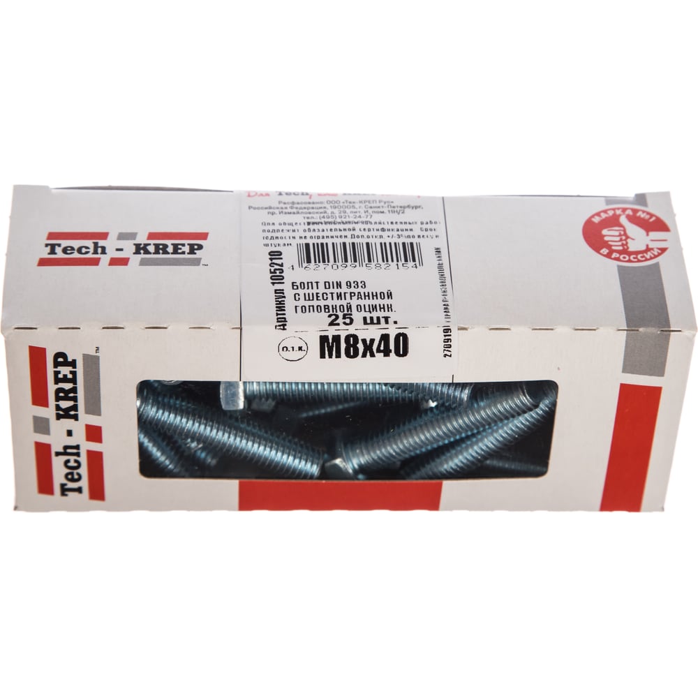 Болт DIN 933 с шестигранной головкой, оцинкованный М8х40, 25шт - коробка Tech-Krep 105210