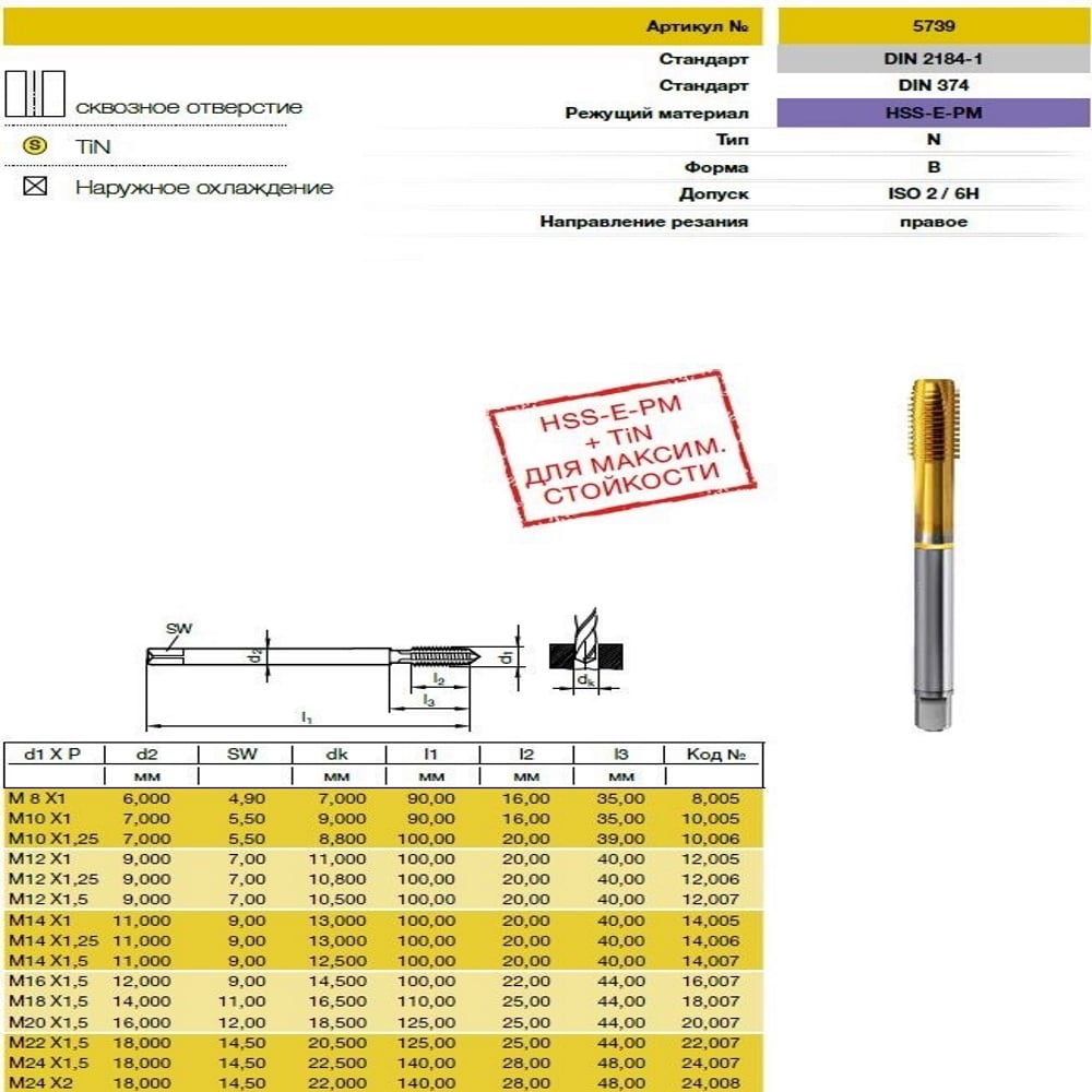 Метчик Guhring M12x1, HSS-E-PM, тип N, TiN, скв. отв., Powertap 5739 12,005