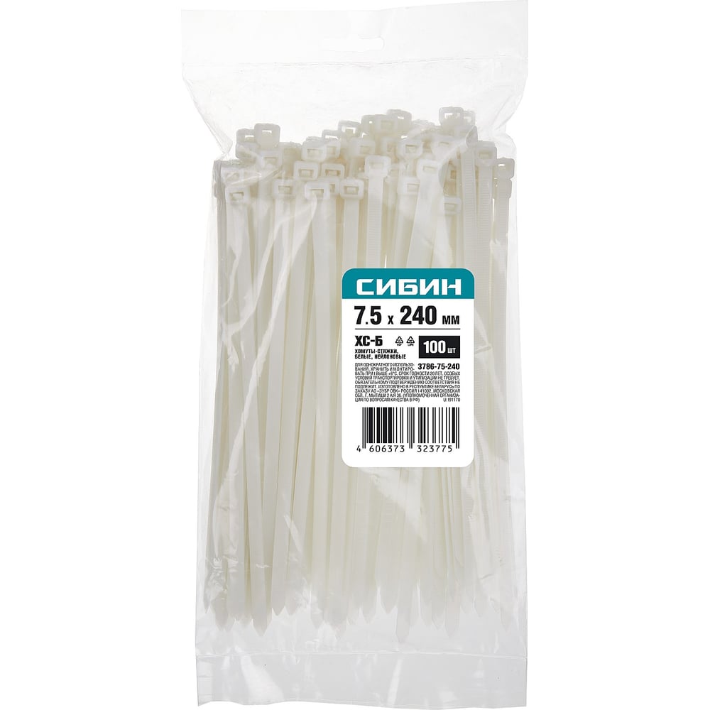 Хомуты-стяжки СИБИН ХС-Б белые, 7.5х240 мм, 100 шт, нейлоновые, 3786-75-240