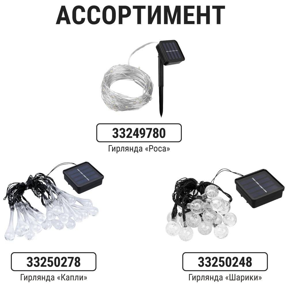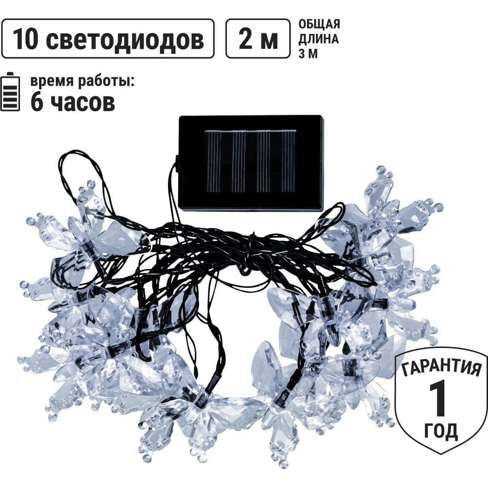 Габариты без упаковки 280х225 мм Тип ландшафтные/гирлянда Лампа в комплекте есть Вес нетто 0.325 кг Мощность светильника 6 Вт Цоколь встроенные светодиоды (LED) Тип лампы встроенные светодиоды Цветность естественный белый (3300-5000 К) Напряжение питания 1.2 В Защита от пыли и влаги IP44 Материал корпуса пластик Материал плафона пластик Вид крепления штырь Коллекция СП Цвет плафона белый Цвет корпуса черный Провод без провода Питание солнечная батарейка Количество ламп 10 шт Датчик движения нет Мощность лампы 0.6 Вт Датчик освещенности да Высота/длина 280 мм Ширина изделия 225 мм Возможность подключения диммера нет