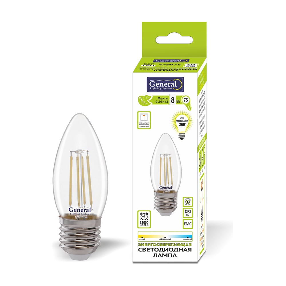 Светодиодная лампа General Lighting Systems Филамент прозрачный E27 8Вт 230В 660Лм 6500К Холодный белый свет Свеча GLDEN-CS-8-230-E27-6500 649976