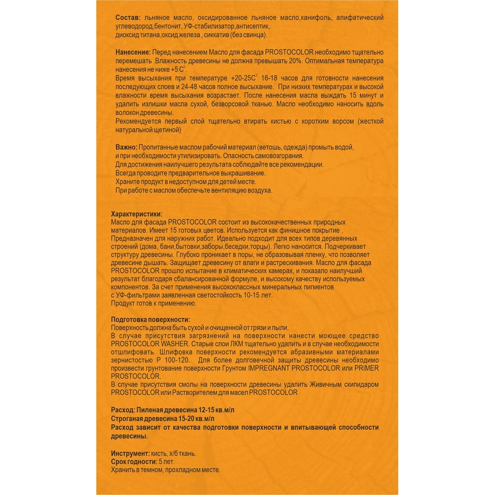 | Состав | льняное масло, древесное масло, масло касторовое, оксидированное льняное масло,канифоль, алифатический углеводород,бентонит, УФ-стабилизатор, антисептик, диоксид титана, оксид железа, сиккатив (без свинца) |