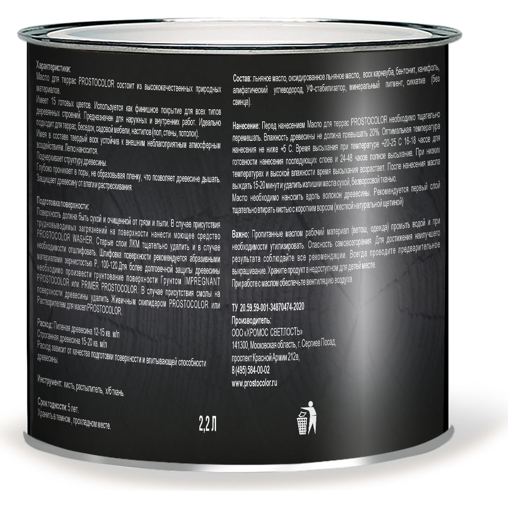 | Состав | Полимеризированное льняное и сафлоровое масло, тунговое масло, воск карнаубский, эфир канифоли, терпентинное масло, алифатический углеводород, бентонит, У/Ф стабилизатор, антисептик, диоксид титана, оксид железа, сиккатив без свинца. |
