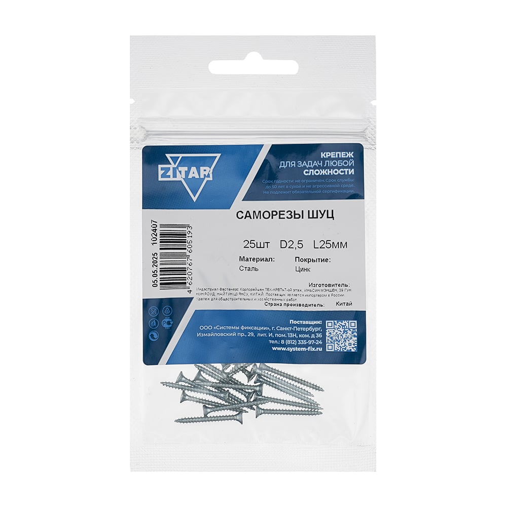 Саморез ШУц 2,5х25 потайная головка 25 шт, пакет Zitar 102407