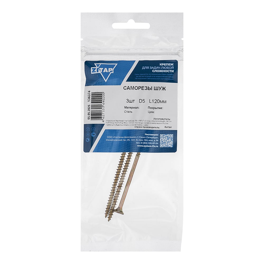 Саморез ШУж с потайной головкой 5,0x120 мм, 3 шт., пакет Zitar 136374