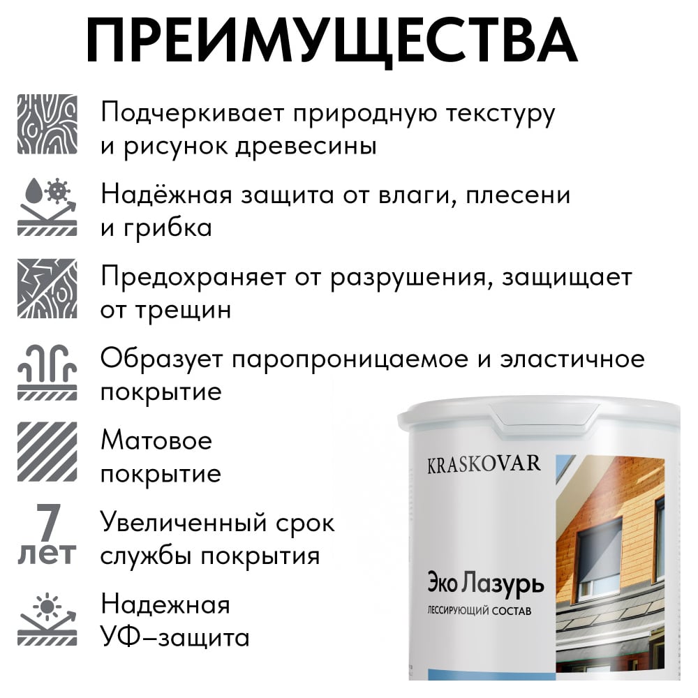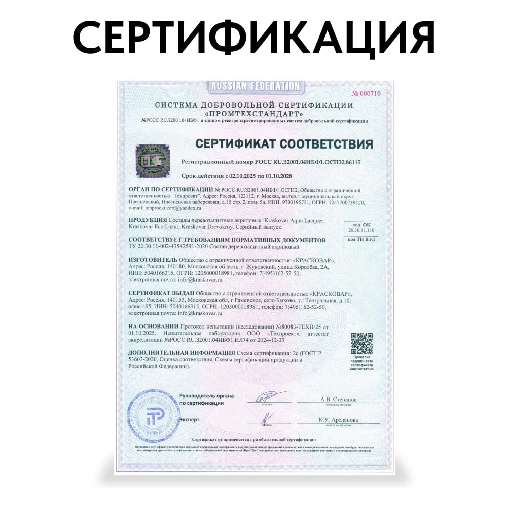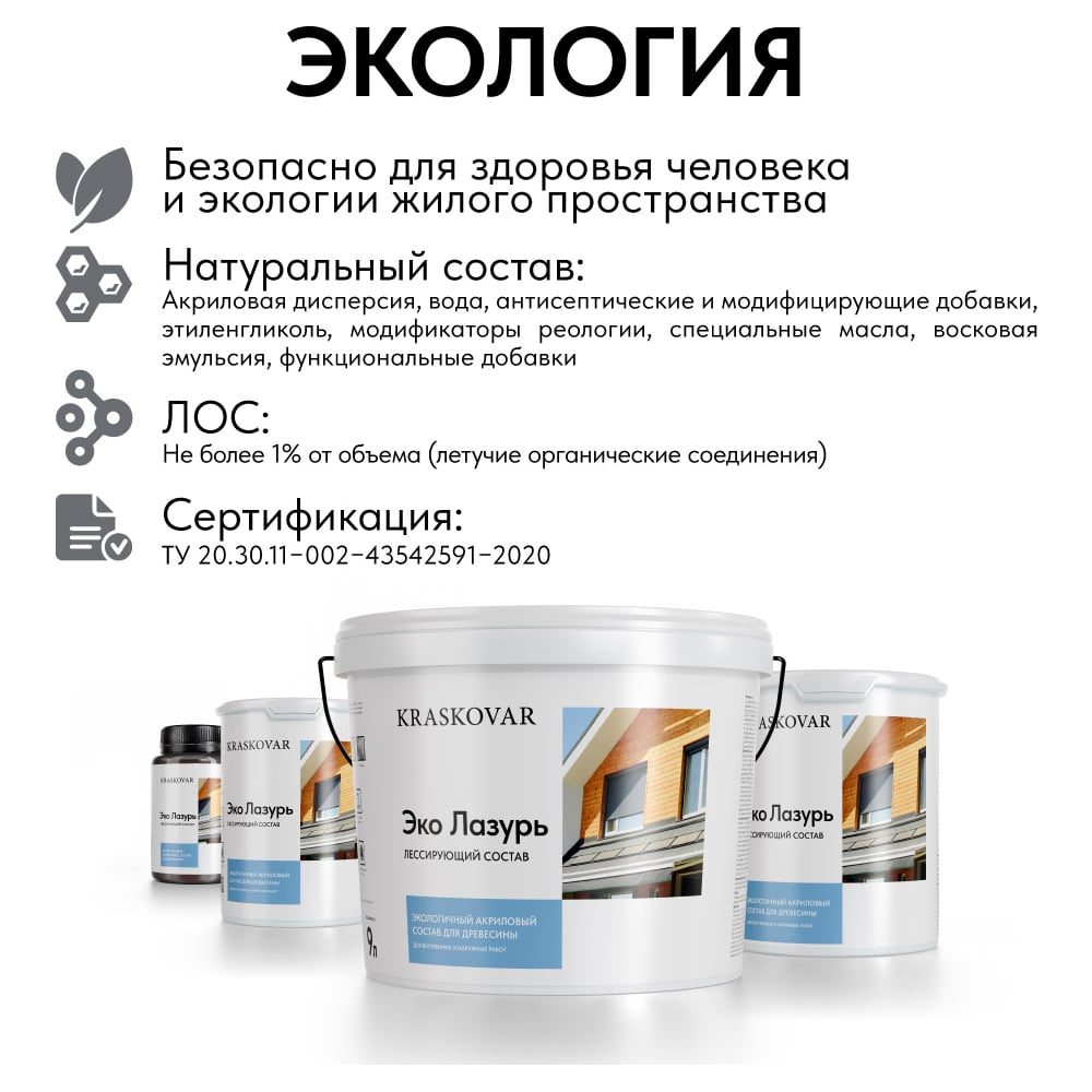 | Состав | акриловая дисперсия, вода, антисептические и модифицирующие добавки, этиленгликоль, модификаторы реологии, специальные масла, восковая эмульсия, функциональные добавки |